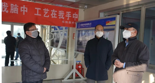 圖為滕方遷到樂(lè)凱醫(yī)療實(shí)地檢查復(fù)工工作