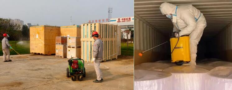 中國樂凱集團(tuán)公共事業(yè)部嚴(yán)格落實防疫要求,進(jìn)口到貨采取“多重消毒”,即進(jìn)口集裝箱進(jìn)入卸料區(qū)后,由消毒人員對車輛和集裝箱進(jìn)行整體的外部消毒;打開集裝箱箱門后,消毒人員進(jìn)入集裝箱,對箱內(nèi)貨物進(jìn)行二次消毒